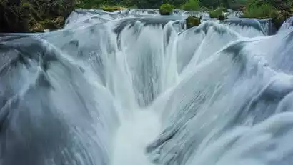 First, we headed to the Doupotang Waterfall Scenic Area, the filming location for the 1986 version of Journey to the West. Atop the waterfall is a vast 15,000-square-meter karst pool, formed on a calcified beach bar that meanders over 100 meters long.