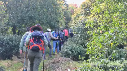 Around 9:30 AM, we warmed up and set off on our sprint. The hike took about 40 minutes, passing Dengwei Mountain and reaching Xuanmu Mountain. The initial hike allowed us to adjust to the pace and stay in shape. Don't fall behind! We then entered Midui Mountain and climbed to the summit for our first glimpse of the stunning Taihu Lake. We continued our journey through the mountains, passing Changshan and the Tanshan Mine. We climbed hills and steep slopes, and continued our long and arduous hike.