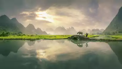 Here, you'll find classic karst mountains, small bridges and flowing water shrouded in mist, farmhouses reminiscent of Tao Yuanming's works, and villagers plowing their fields with oxen. At sunrise, the sun and its rays, reflected in the ponds between the fields, create a beauty reminiscent of the artistic conception depicted in ancient poetry. The farmers and oxen were specially arranged to collaborate on the creation of this work.