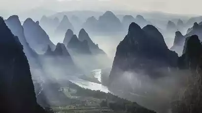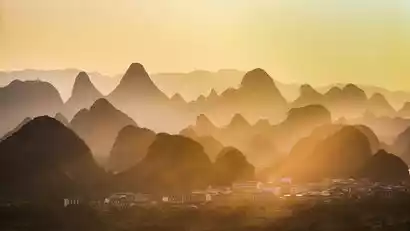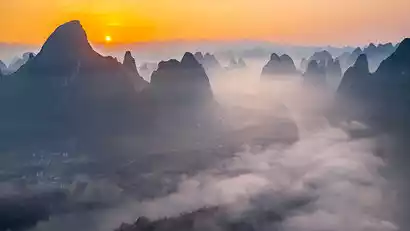 Cuiping Five Finger Mountain is a sacred spot for viewing and photographing the World Heritage Grape Forest, a must-see for landscape artists capturing the idyllic sunset glow. Images captured here have been featured numerous times in CNN, Xinhua News Agency, People's Daily, and other publications promoting the beauty of Yangshuo. However, due to its inaccessibility and lack of development, the area remains relatively unvisited. Climbing to the summit, you'll overlook the old village of Wuguihe, where the sunset glow creates a dreamlike, beautiful scene.