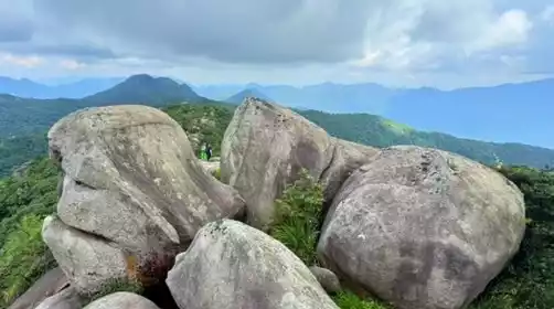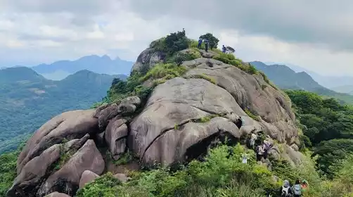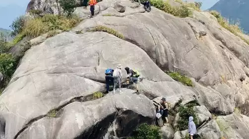 We reached the ridge at noon and chose an open space for a lunch break. We shared our food while gazing out over Tiantangding and Wuzhi Mountain. After a short break, we continued on our way. After a short climb through dense grass, the magnificent Tiger Head Peak appeared before us. Please follow the leader's instructions while climbing Tiger Head. Avoid taking photos near the cliffs or performing dangerous maneuvers while climbing. The grass at the top is quite tall, so wearing long sleeves or sleeves is recommended for protection.
