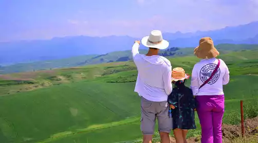 June to September is the perfect time to enjoy the vast wheat fields. A gentle breeze caresses the rolling hillsides, and the wheat waves surge like the ocean's waves, inviting one to hum the familiar melody of "The Wind Blows the Wheat Waves": "Under the distant blue sky, golden waves of wheat surge." We followed the wooden plank road into the vast wheat fields of the Tianshan Mountains, offering panoramic views of the magnificent mountains and rivers. Past the magnificent wheat fields, we arrived at the mysterious Tianshan Strange Slope, certified by Guinness as the "World's Longest Strange Slope." Here, "water flows upwards, and cars have to refuel when going downhill," a scene that evokes a sense of the wonder and majesty of nature.