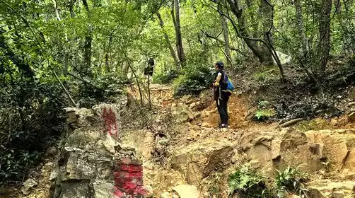 Arriving at our destination around 9:30 AM, our team leader led everyone through pre-climbing warm-ups. Yushan Mountain lies northwest of Changshu City, bordered by the Yangtze River to the north and Shang Lake to the south. It was named after Yu Zhong (also known as Zhong Yong), the ancestor of Jiangnan during the Shang and Zhou dynasties, who was buried there. The southeastern foot of Yushan Mountain extends into the ancient city, earning it the nickname "Ten Miles of Green Hills Halfway into the City." It has now been designated a National Forest Park. Yushan Mountain offers numerous hiking trails, ranging from short ones perfect for morning exercises to more immersive hikes. A classic example is the Yushan Eagle Route, which weaves through diverse landscapes, passing tea plantations, dense forests, ancient trails, plank roads, river valleys, and bridge tunnels, offering a diverse array of scenery. Even more remarkable is the intersection of the trails, forming the shape of an eagle.