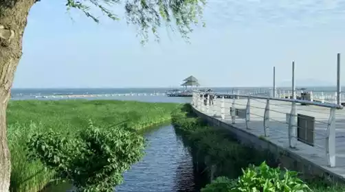 骑到【明月湾古村】,《何以笙箫默》曾在此取景,我们在此稍适休息,在网红码头静静欣赏烟波浩渺的太湖,听一听旁边的蝉鸣鸟叫声。我们骑过古村和果林,在【太湖大桥】上等一场令人心醉的日落,完成我们的环岛骑行
