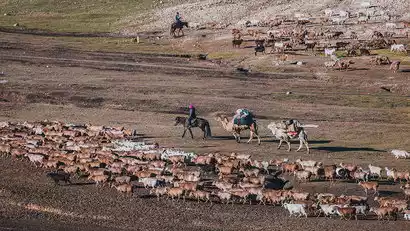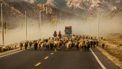 We'll have lunch in a small town along the way, then continue north to Altay. If you're lucky, you might encounter the stunning autumn migration of Kazakh herders. During the autumn season, nomadic Kazakh herders, carrying their cattle, sheep, camels, and horses, along with their belongings, migrate from their summer pastures in the mountains to their winter pastures in the lower terrain. The overwhelming herds of cattle, sheep, and horses, stirring up clouds of dust, create a magnificent spectacle. (The migration of Kazakh herders is quite random, so you can't guarantee you'll see them every tour period.)