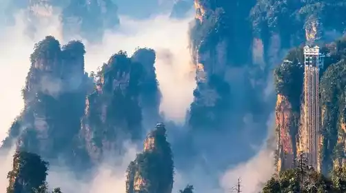In the afternoon, we'll arrive at Yuanjiajie aboard the Bailong Elevator, the world's tallest outdoor elevator. Rising 326 meters, it soars into the sky in 88 seconds. As the elevator emerges from the mountainside, a breathtaking spectacle unfolds before your eyes—a truly breathtaking spectacle worth capturing in your camera!