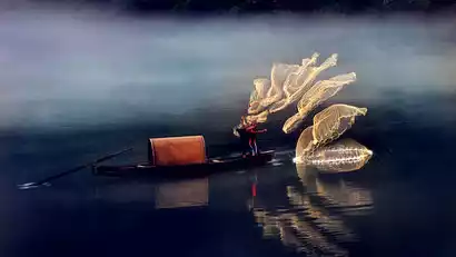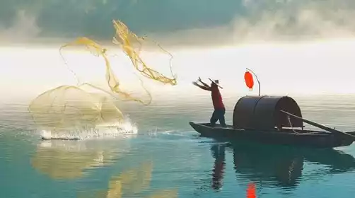 The mist thickens and thins, gathers and disperses, freely flowing across the lake and the mountains. The boat moves and stops. Under the golden sunlight, the fishing net rises from the fisherman's hands, stretches out in the air, and then falls heavily into the lake, splashing countless water, becoming the finishing touch of this painting.