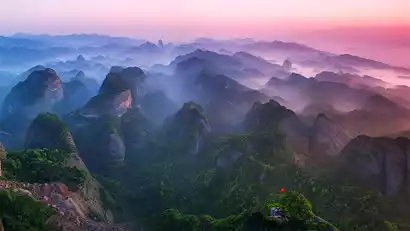 The gathering of divine soldiers - here are gathered more than 30 peaks of various shapes, like a divine army hidden in the deep mountains and dense forests; different from the upward angle of the Bailong Ladder Observation Deck, here is a bird's-eye view, with a shocking and ethereal feeling.