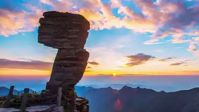 Fanjing Mountain, one of Guizhou's six landmark scenic spots and a sacred mountain in eastern Guizhou, is a captivating wonderland and natural oxygen bar. Renowned poet Wang Xinjian's poem "Crossing Fanjing Mountain" exemplifies its captivating beauty, offering a tranquil escape from worldly worries. Follow China-TravelNote as we ascend the Red Cloud Golden Summit and admire the Mushroom Rocks. Due to Fanjing Mountain's prime location, with luck, you can even witness vast seas of clouds. It's said that those with a connection to Buddhism can even witness the Buddha's halo at the summit. Here, we'll perform a prayer ceremony and make a wish for 2020. These wishes will be written on a prayer plaque and hung at the foot of Fanjing Mountain's Golden Summit. Hopefully, the wishes made in the pure land of Brahma, the Sky City, will soon be fulfilled!