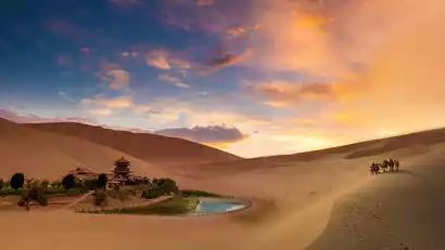 In the afternoon, we'll return to Dunhuang city and rest at the hotel. Once the weather cools down, we'll explore the unforgettable Mingsha Mountain and Crescent Lake scenic area. Here, visitors can enjoy camel riding, sandboarding, and the "one step forward, half step back" experience of climbing Mingsha Mountain. We'll also visit Crescent Lake, the world's premier desert spring, known for its "silver mountain surrounded by sand, a pool of clear water with green ripples." After a satisfying visit, we'll depart.
