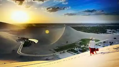 In the afternoon, we will gather at an appropriate time to depart for [Singing Sand Mountain and Crescent Moon Lake]. Tourists can ride camels and go sandboarding here, or experience the "one step forward, half step back" climbing of Mingsha Mountain (disposable sand-proof shoe covers are provided). We will also visit Crescent Moon Lake, the world's first desert spring, which is known as "a silver mountain surrounded by sand on all sides, a pool of clear water with green ripples". After having a good time, we will leave.