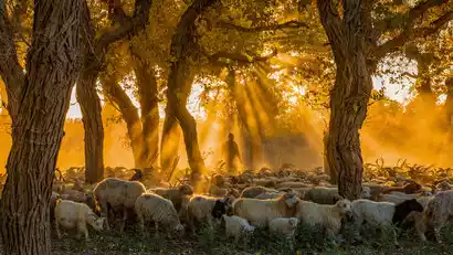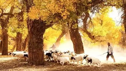 After finishing the creation, I went to shoot the scene of local herdsmen herding sheep. Flocks of sheep passed through the poplar forest. The sun shone through the golden poplar jungle. The sheep ran in the poplar forest and the sand flew.