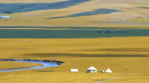 After breakfast, we set off for the Morigele River, which Lao She once described as "the best winding river in the world". We stopped along the way, climbed up to a high point and looked down at the herds of cattle and sheep and the dotted tents on the river bank, which looked like a golden autumn oil painting.