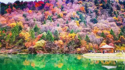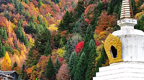 We'll then drive into Bipenggou, known as the "Little Jiuzhaigou." In late autumn (October and November), the maple, birch, pine, and larch trees gradually recover from the frost, transforming their leaves into vibrant crimson and golden yellows, creating a vibrant world of color. Once inside, take in a sightseeing bus through the primeval forest to Bailong Waterfall, Zhuoma Lake, Three Trees, and Moon Bay. Take in the breathtaking views of the valley's pristine forests, the vibrant crimson foliage of wildflowers, sacred snow-capped mountains, towering peaks, and cascading waterfalls, creating a breathtakingly beautiful paradise.