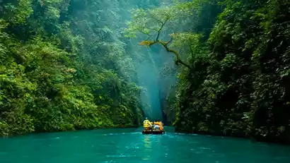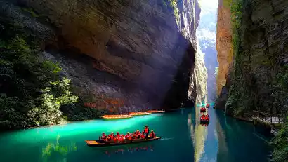 Follow the scenic trail down to the canyon riverside and enjoy the scenery along the way. Different angles give you different views. Here you can feel the emerald green water and sail on the river. The boats sail on the water at the bottom of the canyon, as if floating in the air. Surrounded by cliffs, sailing on the water in the canyon, you can see the clear water at a glance, like sailing in a painting, which is intoxicating. Here you can also get close to the river.