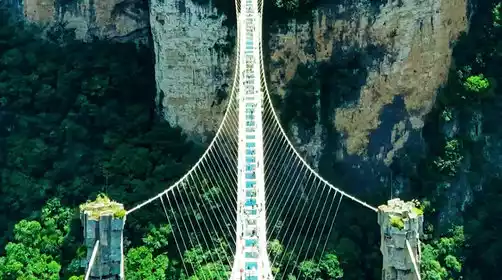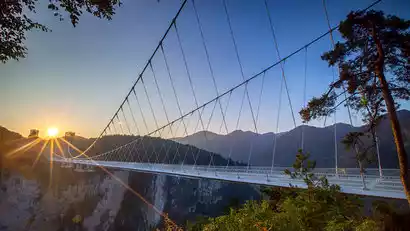 Afterwards, we'll head to the Zhangjiajie Grand Canyon to explore the Yuntiandu Glass Bridge, the world's first cable-stayed, variable-space cable glass suspension bridge. Made of 99 panels of transparent glass, the bridge appears as thin as a cicada's wing from a distance, seemingly "invisible" amidst the mountains and waters. The bridge deck is approximately 300 meters above the valley floor, offering a breathtaking view of the canyon below. We'll then continue our tour of the Grand Canyon.