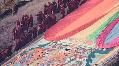 After breakfast, around 10:00 AM, we began photographing the Giant Buddha at Langmusi (Gansu Temple). Tourists joined in this visual feast of faith. Monks from each monastery, led by a great master, carried a massive, colorfully embroidered Buddha statue to a fixed Buddha-drying platform at the foot of a mountain near the temple for display. The monks then extol the Buddha's virtues and recite the Bathing Sutra. The scene was awe-inspiring, with vibrant colors and a sea of Tibetan monks.