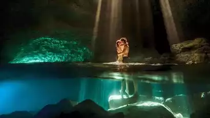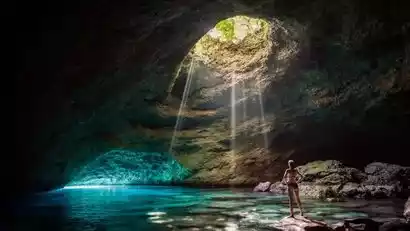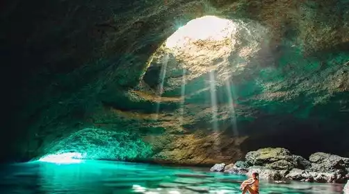 Blue holes are underwater caves formed by a mixture of freshwater and seawater. Centuries, even millennia, of natural bathing, combined with sunlight refraction, create a uniquely clear, blue color. Tourists can experience the light of God and witness the sapphire-blue water. The brave can also swim or snorkel underwater at their own expense.