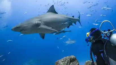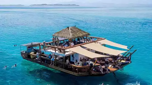 Snorkel with sharks in pristine waters, with only 25-degree clear water separating tourists from these marine predators, no glass cages blocking the way! Feel the adrenaline rush! Cruise to Kuata Island. If you book the shark snorkeling activity, you'll receive a complimentary upgrade to a VIP cabin with air conditioning, offering exclusive seating and comfort. Kuata Island, a hidden gem in the Yasawa Islands, boasts picturesque beaches, crystal-clear waters, and pristine nature. A bar, hammocks, and a swimming pool provide a comfortable experience for tourists. Upon disembarkation, local staff will provide an activity briefing before joining your guide on board to the shark snorkeling reef.