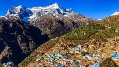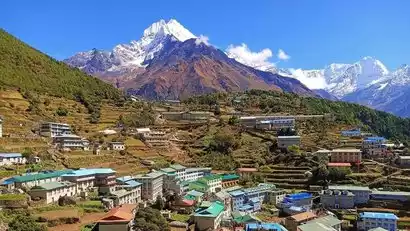 Today we'll spend the day in this famous Sherpa village. This large town on the EBC route offers a place to restock supplies, exchange RMB for Nepalese currency, apply for a mobile phone SIM card, and enjoy the last hot shower on the EBC route. It's also the last place to charge your phone for free. The Sherpa Museum is also located here. Near Namche Bazar are three snow-capped peaks over 6,000 meters: from right to left: Kwangde Peak, Kangtega Peak (6,783 meters), and Thamserku Peak (6,604 meters).
