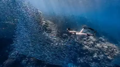 We'll then head to the coral beach at the foot of Pinnacle Mountain for snorkeling. If you're lucky, you might spot sea turtles, sea lions, and Gabonese penguins. These penguins are the second smallest in the world, standing only about 25 centimeters tall. The white-lipped sharks that inhabit this area are also quite non-aggressive.