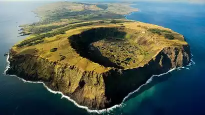 After lunch, drive along the seaside road and you will see hills covered with green grass. This is San Rano Raraku.