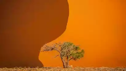 Rise early and transfer to a 4WD vehicle at the Red Desert Scenic Area to visit the Namib Desert's unique wonder of life, the Death Basin, where you can photograph its thousand-year-old trees. The Death Basin, a world-renowned natural heritage site, features lonely, century-old camel trees standing tall, a desolate and majestic sight. The remnants of former riverbed soil on the ground create a striking contrast with the layers of red sand dunes and blue sky, creating an unforgettable scene.