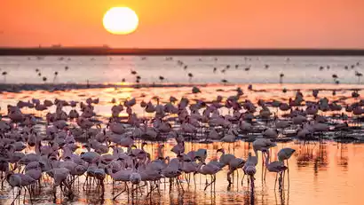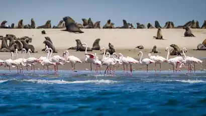 In the afternoon, we'll embark on another exciting excursion: Sandboarding at Whale Bay and Sandwich Bay. With the Atlantic Ocean on one side and the world's tallest sand dunes on the other, we'll capture the unparalleled spectacle of sand flowing into the sea! The desert reaches the ocean, and the ocean flows into the desert, creating a breathtaking symphony of sand and sea. Imagine speeding through the water in an off-road vehicle while taking in the action! Along the way, we'll pass a shallow beach, home to a flamingo habitat. We'll explore and photograph the beautiful flamingos before checking into our hotel for the night.