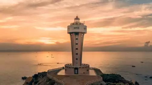 Qian'aowang Lighthouse, whose history can be traced back to the Qing Dynasty, is located on a long pier extending into the heart of the sea. The white tower body and green top contrast with the reefs and waves.