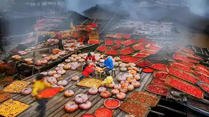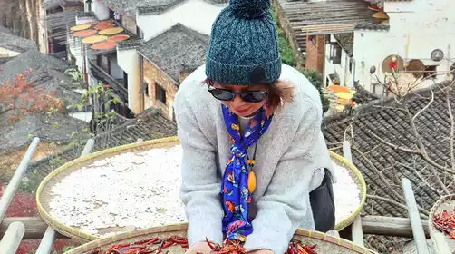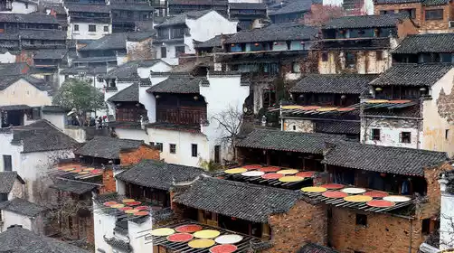 Arriving at the foot of Huangling Mountain, take the sightseeing cable car up the mountain to the ancient village. Huangling is a masterpiece of human culture, with dozens of ancient Hui-style dwellings scattered across the valleys, a hundred-meter drop. Every home features windows for natural light, and racks for drying produce. Villagers use their windows as canvases, racks as brushes, and drying boards as palettes. In spring, they dry bamboo shoots and bracken; in autumn, they dry red peppers, rice, and soybeans. This creates a masterpiece of folk customs that continues year-round.