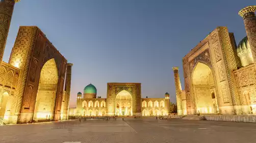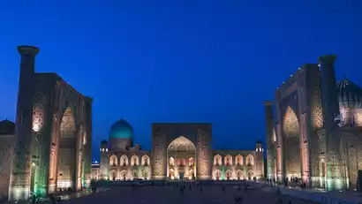Upon arrival, you'll enjoy a special evening tour of the Registan Complex (exterior view). Samarkand's most famous landmark, comprising three madrasas and a square, is known as the "Heart of Samarkand." As the sunset fades and night falls, the lights of the Registan Square cast a more magnificent and mysterious light on the magnificent and exquisite Registan complex.