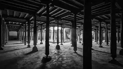 Afterwards, we'll visit the exterior of the Porokoz Mosque (the interior is closed to locals, as it's a place of worship). This is one of Bukhara's most noteworthy buildings. Its unique feature is the 20 massive carved wooden pillars at the entrance. In Uzbekistan, wood is more valuable than stone or brick, and with 20 such tall wooden pillars, even with the erosion of time, the intricate carvings can still be seen.