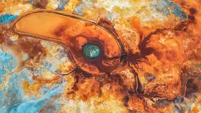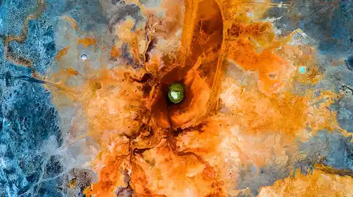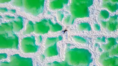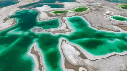 Our journey of exploring hidden gems begins in Mangya. First, we head to Aiken Spring, a geothermal spring deep in the Aral Grassland of Haixi Prefecture that has been bubbling for millennia. From the air, it resembles a medical cross-section of an eye, its veins clearly defined and lifelike. Dotted around it are numerous small cyan springs, and in the eyes of photographers, it resembles a phoenix spreading its wings in flight.