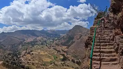 Today we'll embark on a longer journey from Puno to Cuzco by public bus. En route to Cuzco, we'll visit the town of Pucara and the Pucara Lithic Museum. Pucara was the first urban settlement in the highlands, with a civilization that existed between 300 and 100 BC. After a short rest, we'll continue to Cusco's highest point, at 4,313 meters above sea level, where we'll have lunch in Sikuani. We'll then visit the Inca ruins of Raqchi, dedicated to the powerful Andean god Wiracocha. The 20-meter-high rectangular structure, topped with thatch, symbolizes the highest point in the New World. We'll then visit the Church of Andahuaylillas, known as the "Sistine Chapel of the Americas," renowned for its high-quality artwork. Built in the 16th century, it incorporates colonial elements within Wari ruins. We'll also have the opportunity to explore the beautiful churches of the Huaro and Checacupe districts. After the final stretch of the drive, we arrived at Ollantaytambo (2,800m above sea level).