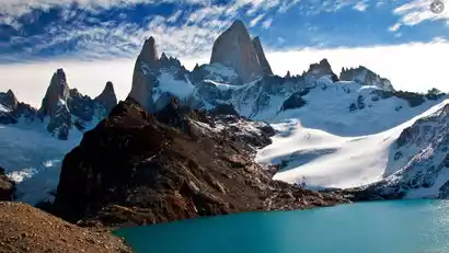 Fitz Roy's hanging glacier cascades into the water, with the mountain's vertical walls rising from the ice. The glacier can often be heard creaking as it slowly descends down the mountainside and freezes.
