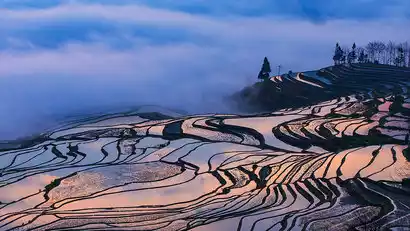 Depart for Yuanyang at the right time. Along the way, you'll encounter a dazzling array of tropical fruit stalls and banana groves undergoing harvest. After a short rest, take the winding mountain road up to Ailao Mountain. Upon entering the Yuanyang Scenic Area, check in (depending on your arrival time) and arrive at Bada in time to enjoy the sunset. Standing in Bada, as the sun sets and the sky turns crimson, the thousand-year-old terraced rice fields stretch far below you. From mid-September to early October, the rice harvest ripens, and the terraces radiate a golden hue across the mountains. From November to April, the irrigated terraces reflect the sunset like mirrors, casting a warm golden hue against the backdrop of their graceful curves. A true marvel at the unparalleled craftsmanship of man and nature.