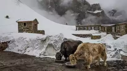 The hiking trail descends along the riverside, crossing the Khangsar River to reach Khangsar, a traditional village known as "Nepal's Last Village." If you time it right, around April each year, you'll be treated to a vibrant display of rhododendrons—nine species, to be exact—blooming along the path, creating a breathtaking spectacle. The rhododendron is Nepal's national flower, and stumbling upon a vast expanse of it during this season is truly a stroke of luck. And if that's not enough, the area is home to 100 mammal species, 60 reptile and amphibian species, and over 450 other species.