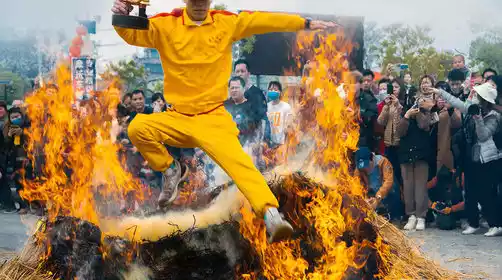Jumping over the fire is a local custom in Puning. Xidong Village holds this activity on the night of the 15th and afternoon of the 16th day of the first lunar month, symbolizing the farewell to the old and the welcome to the new. Villagers, young and old, light a blazing bonfire outside their gates or along the main road and jump over it to ward off bad luck. For teenagers approaching adulthood, jumping over the fire is a rite of passage in their hometown.