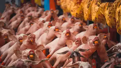 Shuolian Village in Xinheng Town has a parade of gods that has been practiced for over 500 years. In 2009, it was inscribed on the provincial list of intangible cultural heritage: the "Pan Pig and Sheep" ritual, also known as the "Big Pig Race." This folk custom is a way for local villagers to honor the gods of wealth, Zhao Gongming and Guan Gong. The ten natural villages (commonly known as the "Ten Shes") within Shuolian Village rotate in hosting the event. Residents display live pigs and whole sheep, each with an orange in its mouth, symbolizing good luck for the new year. Villagers use the "Big Pig Race" to showcase their family's wealth. The offerings on the altar reflect the generosity of the Chaoshan people: Chaoshan rice cakes, premium tobacco, tea, and alcohol, seafood, bonsai, and flowers. In addition to the pig and sheep displays, there's also a gong and drum troupe, Yingge dance, and other activities. The village is bustling with activity, as villagers carry the deities through a parade, accompanied by the sounds of firecrackers and drums, creating a festive and joyful atmosphere.