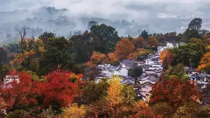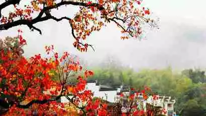 We'll gather in time and continue to Tachuan, a small village bathed in autumn colors. The tallow trees planted by ancient people at the entrance and surrounding areas of Tachuan village transform from green to yellow, then red, creating a vibrant display of color after the frost. In the afternoon sun, the mountains are blanketed in autumn leaves, shading the pink walls and black tiles. We'll delve into Tachuan to savor its stunning autumn scenery, one of China's ten great autumn colors. Witness the shifting hues of gold, orange, pale crimson, and orange-red, all simultaneously reflected in a single tree.