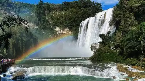 First, we'll visit Huangguoshu Waterfall. The water, drawn from the Baishui River, cascades down from dozens of meters into the air. From a distance, the falls appear to hang over a river, while up close, they resemble a silver dragon. The roar is resounding and resonant, and can be heard from far away. We'll enjoy a 360-degree panoramic view of the falls from above, below, front, and back, feeling the charm of nature and marveling at the insignificance of humankind.
