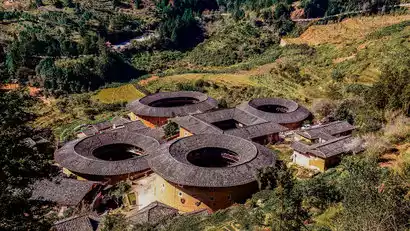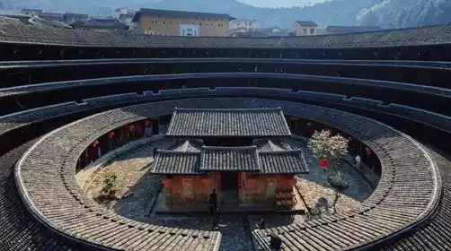 Tianluokeng Tulou, a small Hakka settlement of the Huang clan, consists primarily of a square building, three round buildings, and an oval building. Built according to the Five Elements (gold, wood, water, fire, and earth), they perfectly embody the Eastern philosophical concept of "harmony between man and nature" and the architectural principles of Feng Shui. The complex comprises five large earthen dwellings, a central square building surrounded by three round buildings and an oval building. These buildings follow the undulating terrain, forming a unique and beautifully arranged complex. Due to its unique architectural composition, Luo Zhewen, head of the Chinese Ancient Architecture Protection Expert Group, has called it a "world architectural wonder" and many tourists have nicknamed it "four dishes and one soup."