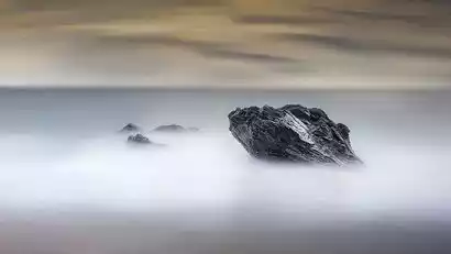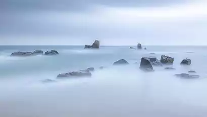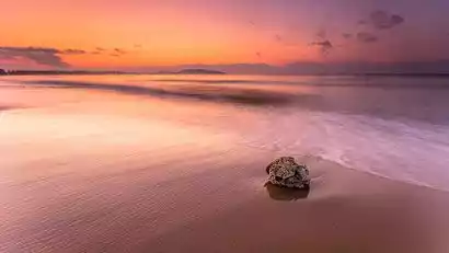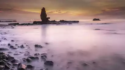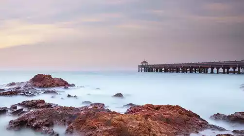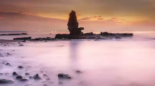 At the mouth of the Wanquan River in Boao, a cluster of reefs juts out from the beach. Because most of the rocks are pink, they're known as "Red Stone Beach." These red rocks, scattered across a range of about five to six hundred meters, are mostly long and narrow, rising evenly from the sea. Clusters and individual rocks stand tall against the silvery waves, weathering the daily tidal surges and the ravages of wind, sun, and rain, adorning the beautiful coastline. In the evening, the sea, bathed in the setting sun, shimmers in a golden hue. Slow-motion photography, like mist and smoke, surrounds the reefs, creating a fairyland-like scene.