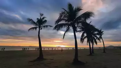 Immerse yourself in the breathtaking atmosphere of coconut breezes and the sea, and the magnificent sunset. As the sun sets, the sunset glow paints the sky, and the white clouds and water are permeated with brilliant colors. Sky, sea, tourists, and swaying coconut trees blend into one, and the interweaving of light and shadow creates a dreamlike experience. Experience the scenery of Sanya Bay, Hainan, and capture the beautiful moments of nature.