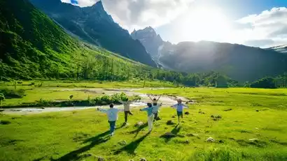 Shuangqiaogou, 3,000 meters above sea level, gets its name from the two wooden bridges within the gully. In spring and summer, Shuangqiaogou comes alive, with lawns carpeted with verdant grass and dotted with tiny flowers. The winding river ripples with clear waves, and on the hillside opposite the river, a myriad of lush greenery shades the silvery, rolling stream, offering a true experience of pastoral scenery. This is an area of concentrated scenic beauty and well-equipped facilities within the Siguniang Mountain region. Sightseeing buses take you directly to the redwood forest at the gully's end, then descend in a descending sequence, effortlessly appreciating the gully's wonders.