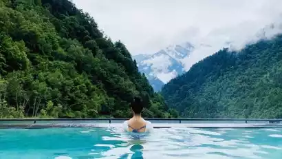 The hotel is nestled within the thousand-year-old Snow Mountain Hot Springs, a natural thermal mineral spring perfect for both bathing and drinking. For generations, it has been revered by people of all ethnic groups on the western Sichuan Plateau as a "Warm Hot Spring," renowned as the "Fairy Mountain Jade Pool, Spiritual Water and Divine Spring." Taking a dip during a long journey is one of life's greatest pleasures. Imagine being surrounded by mountains, under a blue sky and white clouds, or perhaps even a sky filled with stars. Lying in the hotel's warm waters is like a fish released into the river, free to swim, gazing at the distant mountains, and relaxing from all fatigue. (Note 3)