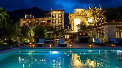 Located in the ancient Zhonglu Tibetan village, the hotel offers breathtaking views from all rooms, along with spacious living spaces, custom furnishings, and elegant interiors. The hotel also boasts a heated outdoor swimming pool, offering a unique experience for families. The hotel also offers a Tibetan hot pot menu featuring authentic local produce and fruits.