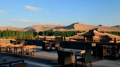 Dunhuang Resort is located at the foot of Mingsha Mountain in Dunhuang. The hotel's design reflects the style of ancient manor houses, with large roofs, long wooden corridors, elegant furniture from the late Tang, Ming, and Qing dynasties, and a northwestern-style enclosed courtyard house built primarily of stone and mud, complete with earthen walls. These elements imbue the hotel with traditional and local characteristics.