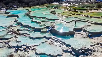 After breakfast, depart for the Huanglong Scenic Area. Known as the "Fairyland on Earth," the ravines are home to numerous colorful pools that transform into vibrant colors depending on the surrounding scenery and the angle of sunlight. Famous for its "four unique wonders" of colorful pools, snow-capped mountains, canyons, and forests, the area is renowned for its magnificent, ingenious, and vibrantly colored travertine formations. Its rare karst landforms are renowned both domestically and internationally, making it a veritable paradise on earth.
