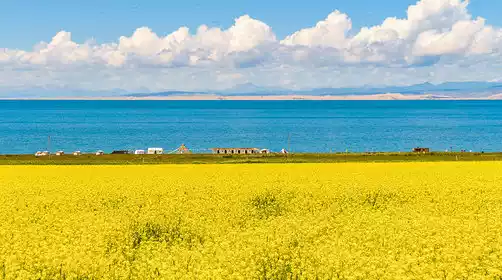 In the afternoon, we'll travel to Qinghai Lake, China's largest inland saltwater lake, resembling a sapphire embedded in the earth. Standing at 3,196 meters above sea level and boasting a 360-kilometer shoreline, the lake boasts icy cold and high salinity. The average temperature in the lake area during midsummer is only 15°C, making it a natural summer retreat. From July to August, thousands of acres of rapeseed flowers bloom, and cattle and sheep roam among them. The azure waters are punctuated by brilliant golden yellow, creating a breathtaking spectacle unique to plateau lakes.